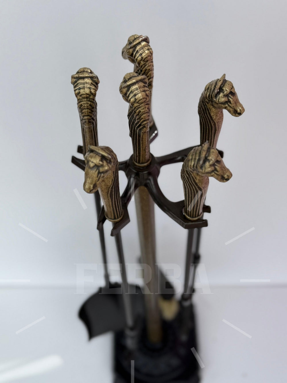 Antik Bronz At Figürlü Şömine Maşa Takımı
