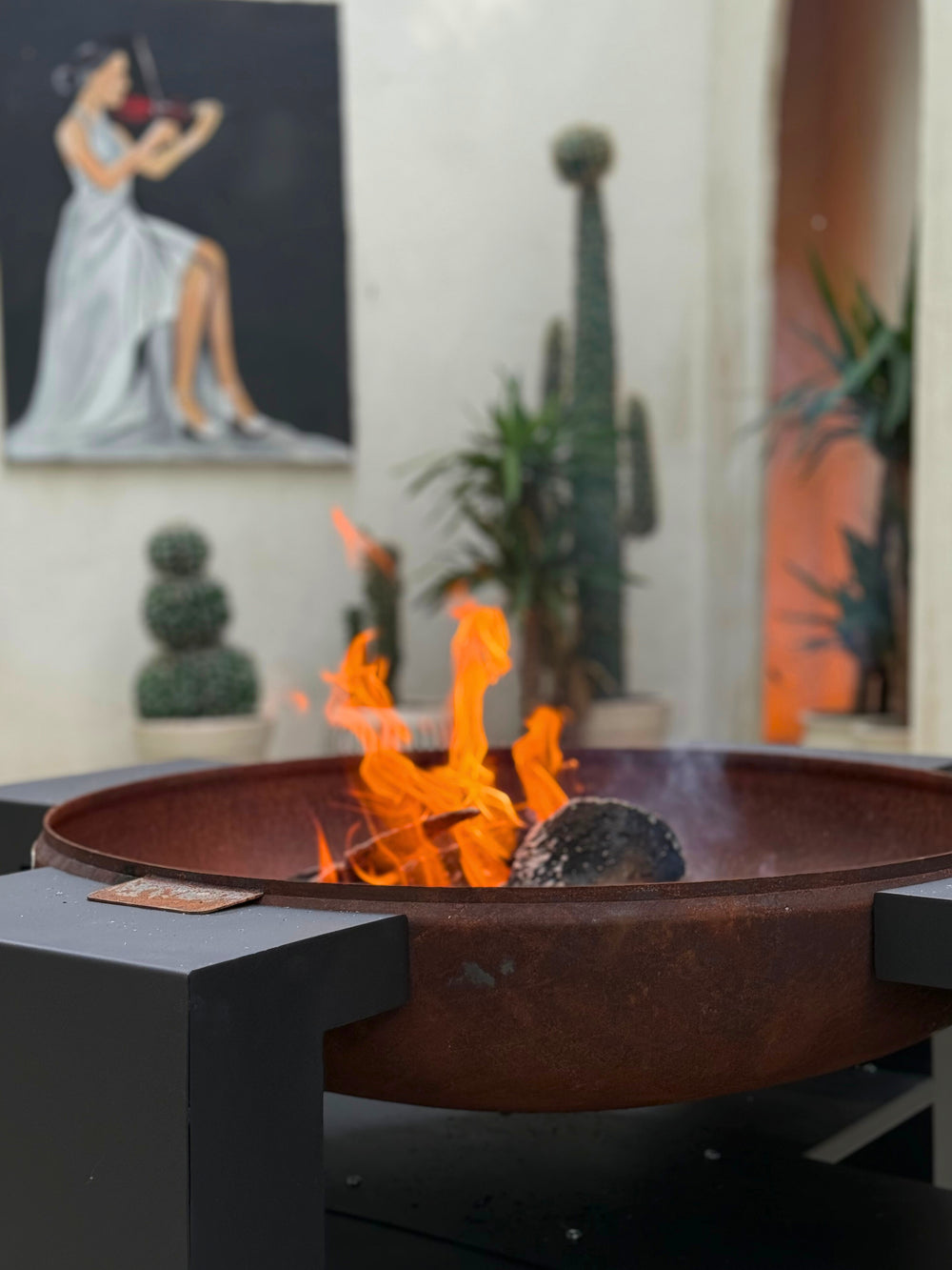 Rustik Estetik: Ateş çanağı, özel ortam koşulları kontrollü olarak paslandırılmıştır. Doğal kırılan bu yüzeyin her aşınması güçlü bir karakter yaratır.