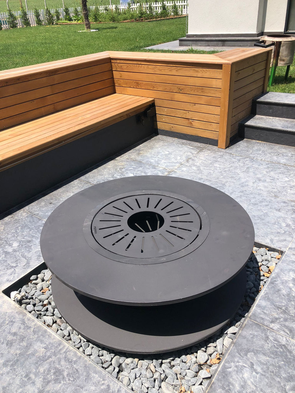 -Pişirme: Bazı bahçe şömineleri, et veya sebzeleri korumak için özel olarak tasarlanmıştır. Şöminenin üzerinde bir ızgara veya yemek pişirme bölümü bulunabilir, böylece açık havada yemek güvenliği mümkün olur.
